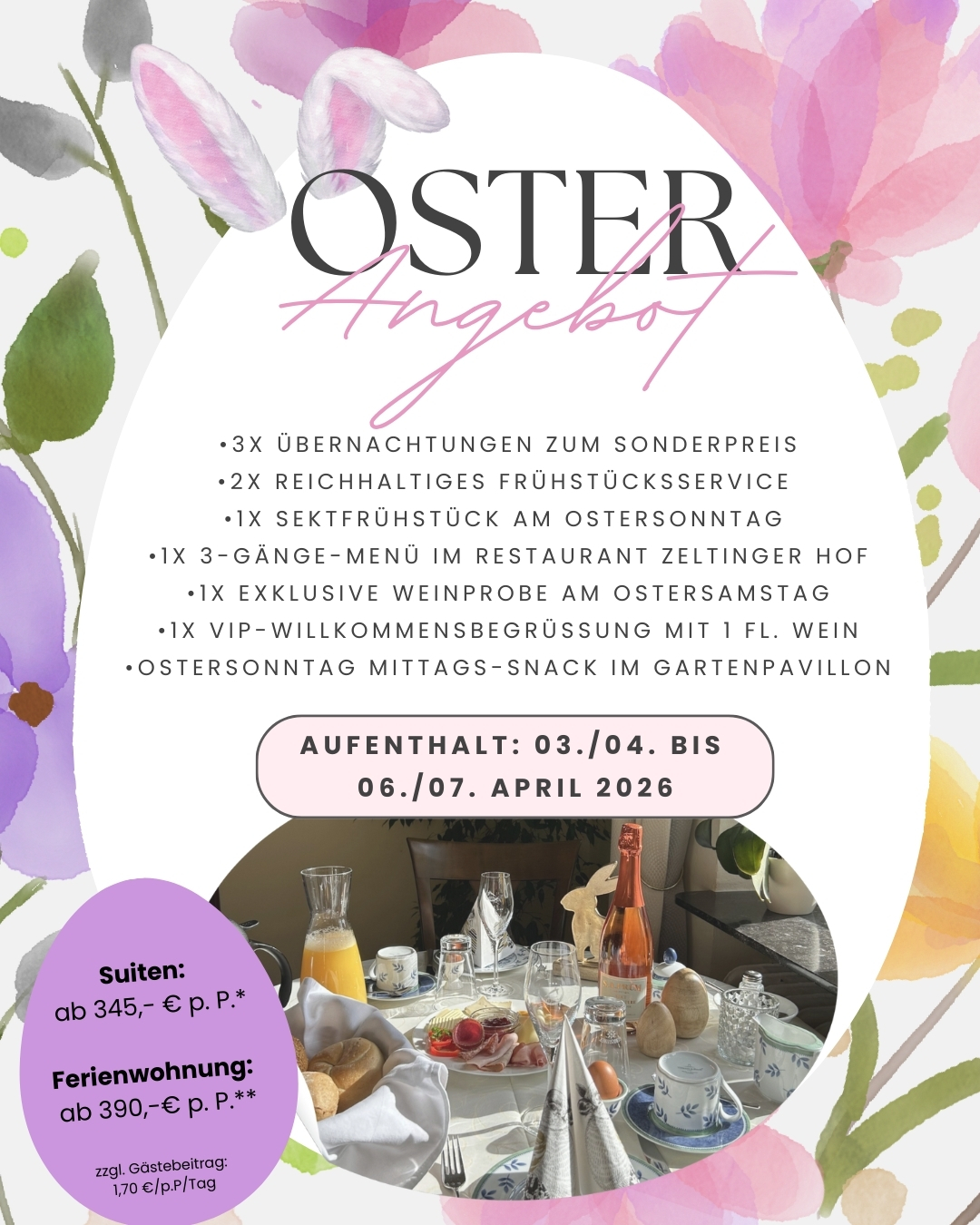 Starten Sie den Tag mit einem reichhaltigen Frühstück, das Ihnen am Tisch serviert wird. Am Ostersonntag werden Sie mit einem Sektfrühstück mit allerlei Köstlichkeiten verwöhnt. Sie können an einem der Abende ein 3-Gang-Menü im Restaurant Zeltinger Hof im Nachbarort genießen (ohne Transfer). Am Samstagnachmittag werden Sie in die Welt unserer Rieslingweine entführt und können die Besonderheit des Moselriesling erleben. Am Sonntagmittag reichen wir Ihnen in unserem Gartenpavillon einen leichten Mittagssnack.