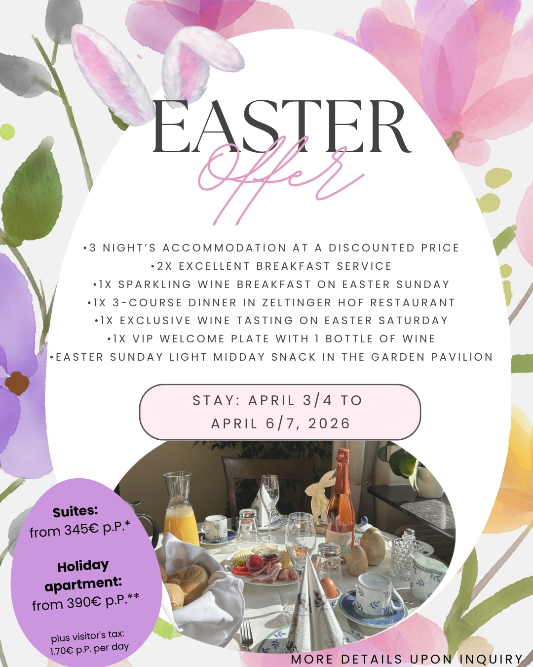 Start the day with a hearty breakfast served at your table. On Easter Sunday, you will be treated to a champagne breakfast with all kinds of delicacies. On one of the evenings, you can enjoy a 3-course meal at the Zeltinger Hof restaurant in the neighbouring village (no transfer required). On Saturday afternoon, you will be whisked away into the world of our Riesling wines and experience the uniqueness of Moselle Riesling. On Sunday afternoon, we will serve you a light lunch snack in our garden pavilion.